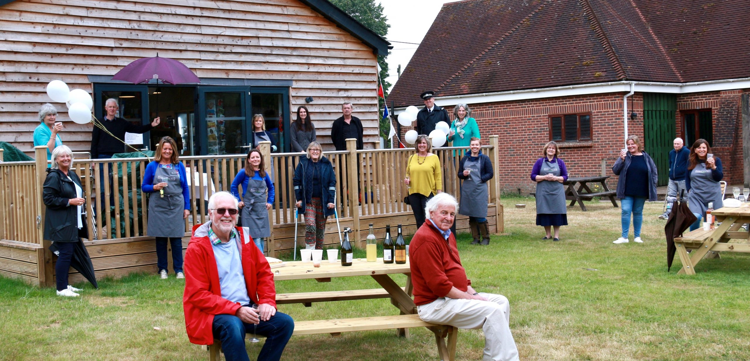 Past and present committee members, volunteers and locals gather in the rain to celecrate our first birthday